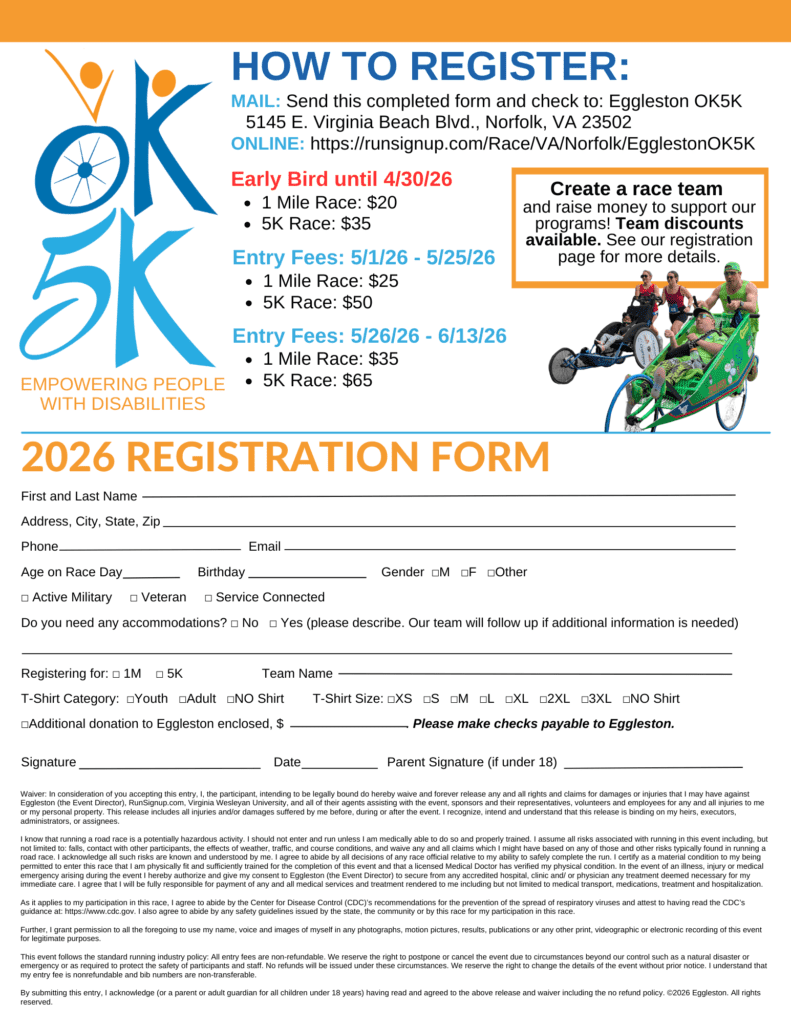 The Eggleston OK5K & 1 Mile Run, Walk & Roll is more than a race—it’s a celebration of community, inclusion, and possibility. Join us for a memorable morning on the beautiful campus of Virginia Wesleyan University, where every step helps make a difference right here in Hampton Roads.
