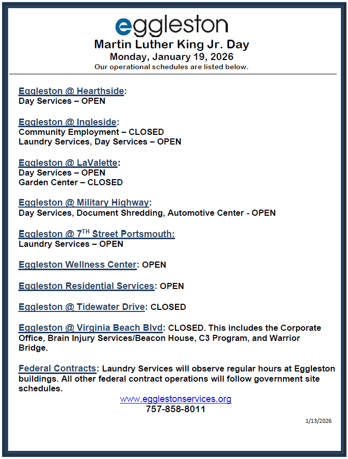 Please use these lists as a guide for our January 19, 2026 hours in observance of the Martin Luther King Jr. holiday. For questions or additional information please call our front desk team at 757-858-8011 or email them at Info@egglestonservices.org