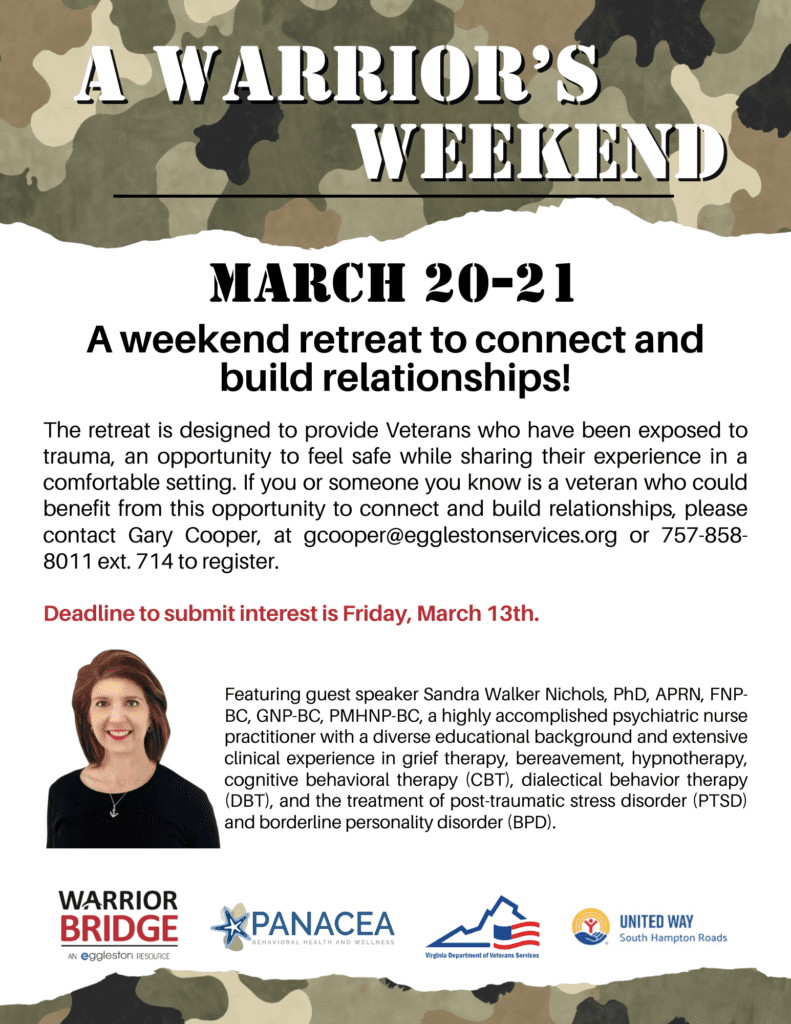 The retreat is designed to provide Veterans who have been exposed to trauma, an opportunity to feel safe while sharing their experience in a comfortable setting. If you or someone you know is a veteran who could benefit from this opportunity to connect and build relationships, please Gary Cooper, at gcooper@egglestonservices.org or 757-858-8011 ext. 714 to register.