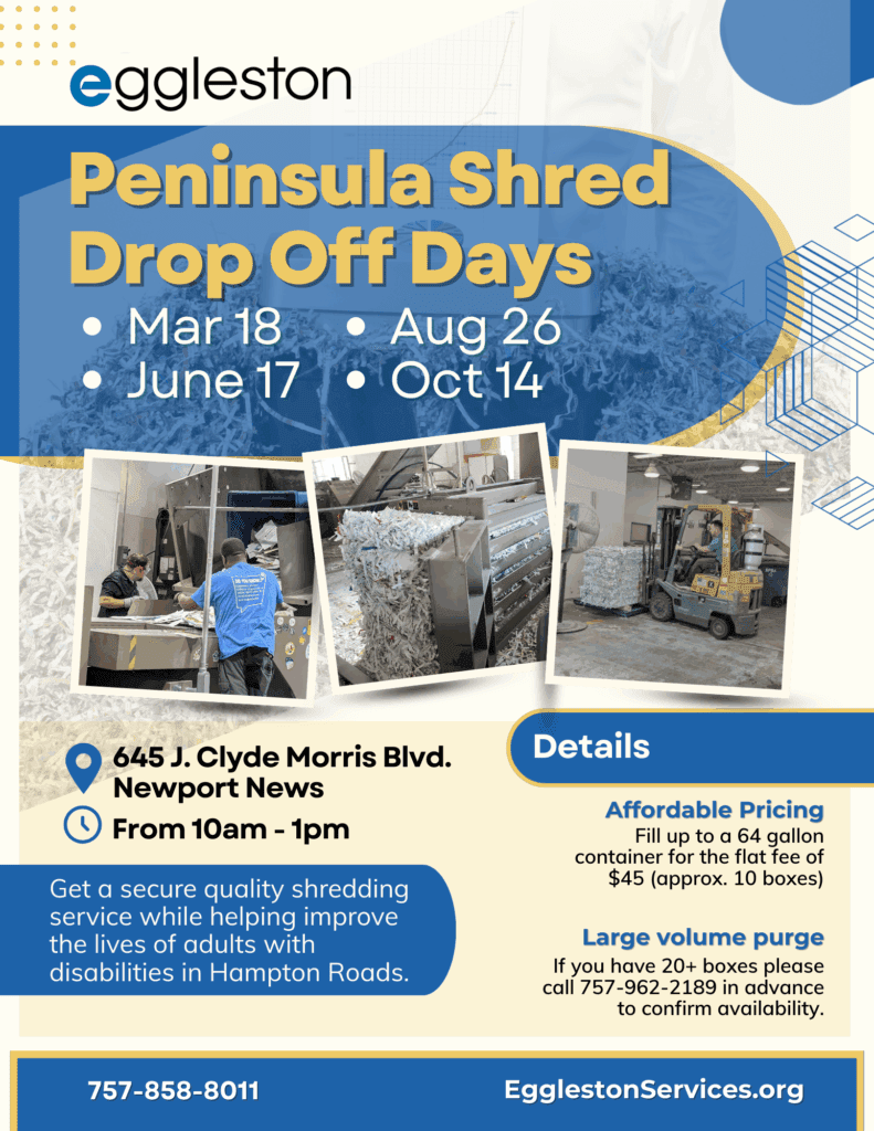 Join Eggleston for our upcoming Peninsula Shredding Drop Off Days and receive secure, high-quality document shredding services while helping support meaningful employment for adults with disabilities in Hampton Roads.