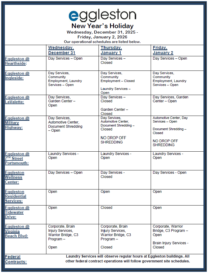 Please use this lists as a guide for our hours on December 31, 2025 – January 2, 2026, in observance of the New Year’s Holiday holiday. For questions or additional information please call our front desk team at 757-858-8011 or email them at Info@egglestonservices.org